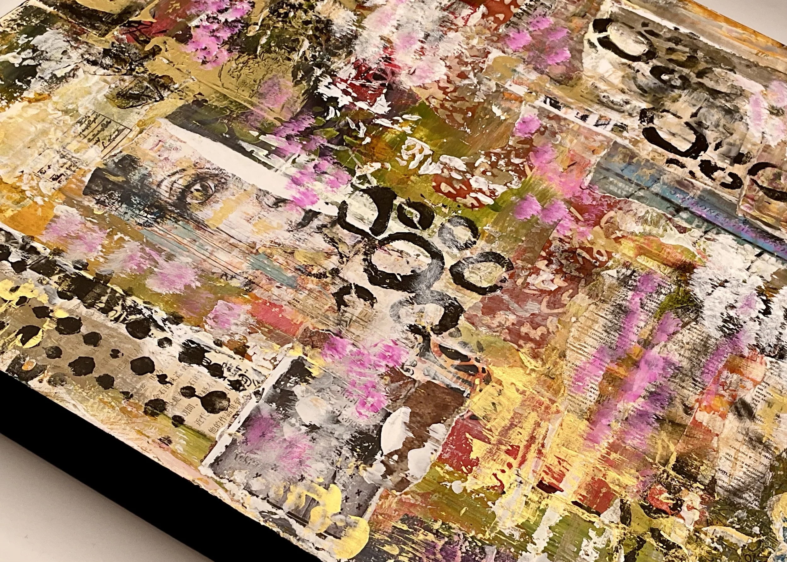 The palette is bold yet refined: soft pinks and stark blacks play against bright white and luminous gold. The modeling paste adds solid dimension, creating ridges and surfaces that catch light and shadow. The layered text and images beneath the paint peek through in fragments, hinting at buried narratives and erased identities.